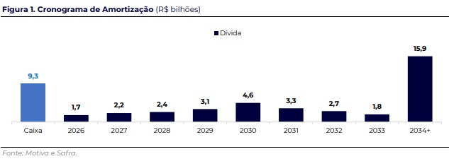 A posição de caixa consolidada de R$9,3 bilhões é confortável e cobre as amortizações de 2026 (R$1,7 bilhão) em mais de 5,5x. Considerando os vencimentos de 2026 e 2027 combinados (R$3,8 bilhões), a cobertura ainda é de 2,4x.