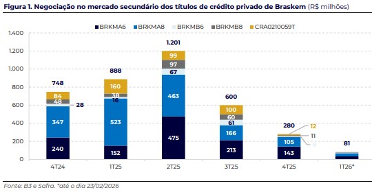 - Não pagamento de juros pela Braskem Idesa: em 20 de fev/26, a Braskem Idesa, subsidiária da Braskem no México, comunicou o não pagamento dos juros referentes às suas notas seniores garantidas com vencimento em 2032. O evento ocorre após a ausência de avanço nas negociações com credores, dado que a empresa rejeitou os termos apresentados na contraproposta apresentada pelo grupo em janeiro, conforme já reportado em nossa última atualização da companhia (link). Em nov/25, a subsidiária havia deixado de pagar US$33 milhões em cupons das notas com vencimento em 2029, cujo principal soma US$900 milhões.