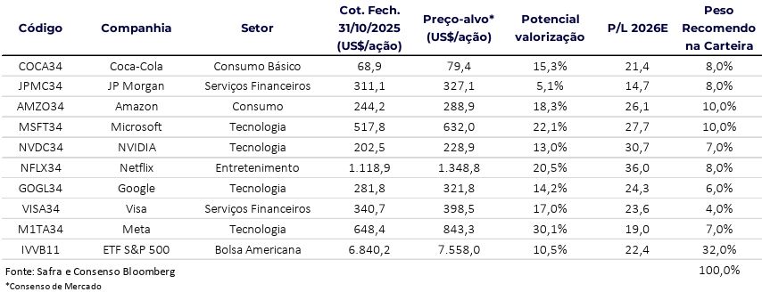 A Carteira Top 10 BDRs recomenda pelo Banco Safra tem ajustes táticos de peso dos papéis com intuito de aumentar a indexação. Aproveitando forte alta após resultado, o Safra reduziu o peso da Alphabet (GOGL34) para dar espaço a um aumento em Meta (M1TA34), que apresentou uma reação exagerada após a divulgação do balanço, na avaliação dos especialistas.