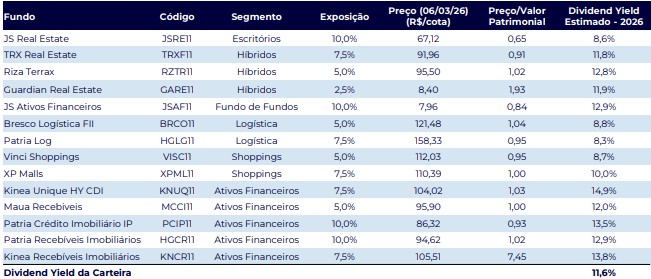 Carteira de fundos imobiliários segerida para março: JS Real Estate (JSRE11); TRX Real Estate (TRXF11); Riza Terrax (RZTR11); Guardian Real Estate (GARE11); JS Ativos Financeiros (JSAF11); Bresco Logística FII (BRCO11); Pátria Log (HGLG11); Vinci Shoppings (VISC11); XP Malls (XPML11); Kinea Unique HY CDI (KNUQ11); Mauá Recebíveis (MCCI11); Pátria Crédito Imobiliário Índice de Preços (PCIP11); Pátria Recebíveis Imobiliários (HGCR11) e Kinea Recebíveis Imobiliários (KNCR11).