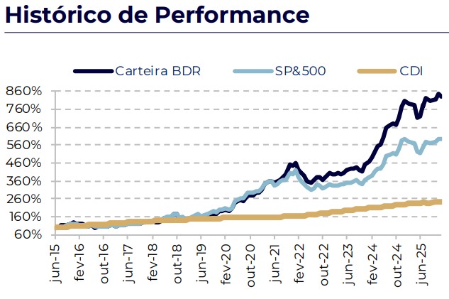Desde o lançamento, em junho de 2015, a valorização acumulada da Carteira Safra Top 10 BDRs é de 757,65%, superior à do S&P 500, CDI e Ibovespa