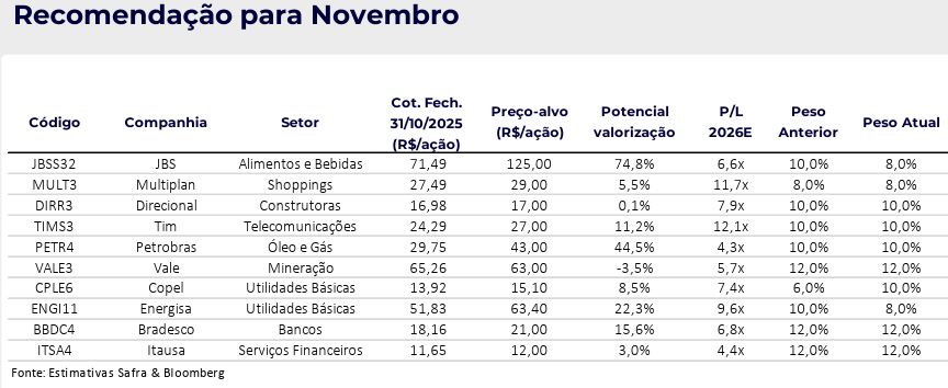 O Banco Safra fez ajustes finos e manteve a lista de ativos da Carteira Top 10 Ações recomendadas para novembro. O banco reduziu o peso de Energisa (ENGI11) e JBS (JBSS32) para aumentar o peso de Copel (CPLE6).