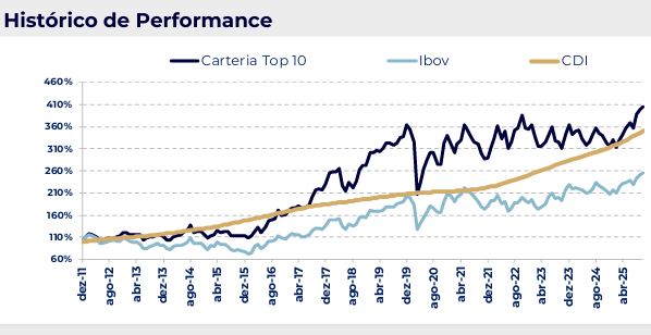 Desde o lançamento, em janeiro de 2012, a Carteira Safra Top 10 Ações alcançou valorização de 305,02%, contra 156,20 do Ibovespa