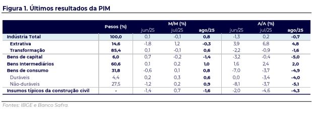 Destaca-se o desempenho positivo dos produtos farmoquímicos e farmacêuticos, com crescimento de 3,8% no mês. Apesar do resultado positivo em agosto, a PIM não altera o cenário de arrefecimento da atividade projetado pelo Banco Safra.