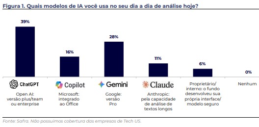 Há uma clara diferença na escolha das ferramentas. Enquanto 39% dos analistas e gestores do mercado utilizam individualmente o ChatGPT como sua principal ferramenta, o ambiente corporativo é dominado pelo Copilot da Microsoft (40%), refletindo possivelmente a integração com o ecossistema Office e maiores requisitos de segurança corporativa.