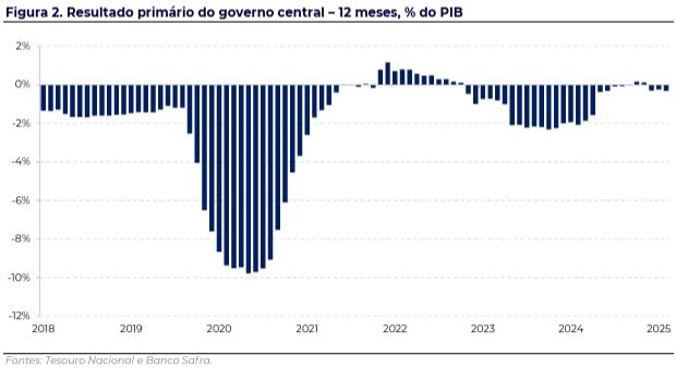 Esse ritmo mais brando, combinado à possibilidade de menores despesas relacionadas ao plano de contingência às tarifas de importação dos EUA, traz viés de baixa para a projeção do Safra de gastos até o fim de 2025 e, consequentemente, de melhora para o resultado primário.