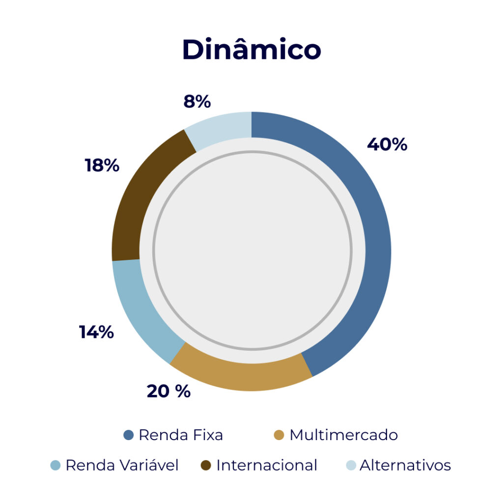 Investidores dinâmicos aceitam oscilações significativas em seus investimentos em busca de maiores potenciais de retornos. Poderá haver maior exposição à Renda Variável, Fundos Imobiliários e Internacional, com o objetivo de potencializar retornos diferenciados. O foco no longo prazo é muito importante para este investidor.
