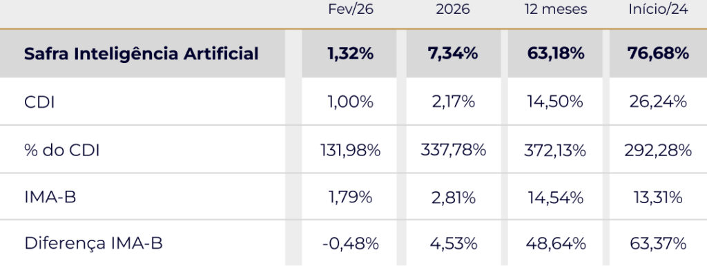Rentabilidade do Fundo Safra Inteligência Artificial em fevereiro de 2026, no acumulado do ano, em 12 meses e desde o início de 2024, em comparação com CDI e IMA-B.