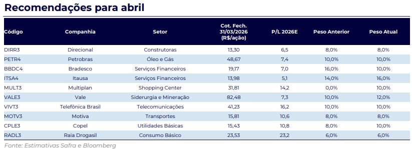 Segundo o material de abril, a carteira mantém uma visão construtiva para todos os nomes atualmente alocados. As alterações promovidas neste mês refletem, de acordo com o Safra, ajustes marginais de risco-retorno, sem mudança de convicção estrutural sobre a tese da carteira.