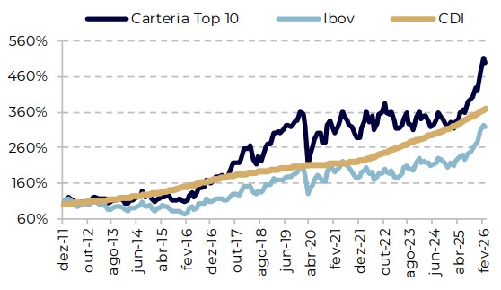 O principal argumento comercial e técnico da Carteira Top 10 está no histórico de performance. Em 2026 até março, o portfólio acumulou alta de 18,57%, acima dos 16,35% do Ibovespa e muito superior aos 3,36% do CDI, segundo o relatório.