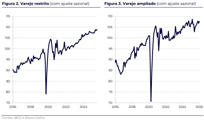 No recorte do varejo restrito, os dados ficaram, em geral, alinhados às projeções do Safra. Entre os destaques positivos, o segmento de vestuário registrou alta de 1,8% em janeiro, recuperando parte das perdas observadas no final do ano passado.