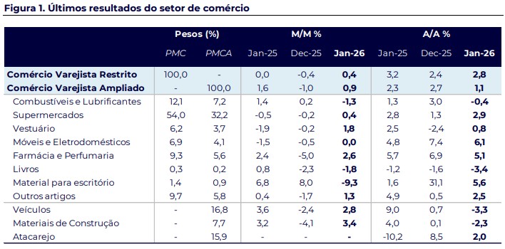 Esse resultado reforça a leitura de que fatores como mercado de trabalho resiliente, ganhos adicionais de renda decorrentes das mudanças no Imposto de Renda da Pessoa Física e o avanço do processo de desinflação começam a oferecer algum suporte ao consumo no início do ano.